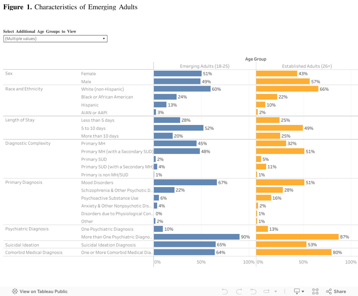Emerging adults have differences in demographics and clinical presentations compared to older adults. On average they are more often female and less likely to be white compared to older adults. Two-thirds of emerging adults are in care for a mood disorder, compared to only half of the older adult group, and emerging adults have significantly fewer episodes of care for schizophrenia or substance use. Emerging adults are also the only age group where more than half of patients have a recorded diagnosis of suicidal ideation. While over half of all adult inpatients have a dual diagnosis (55.4%), less than half (48.6%) of emerging adults have the same (See Figure 1).